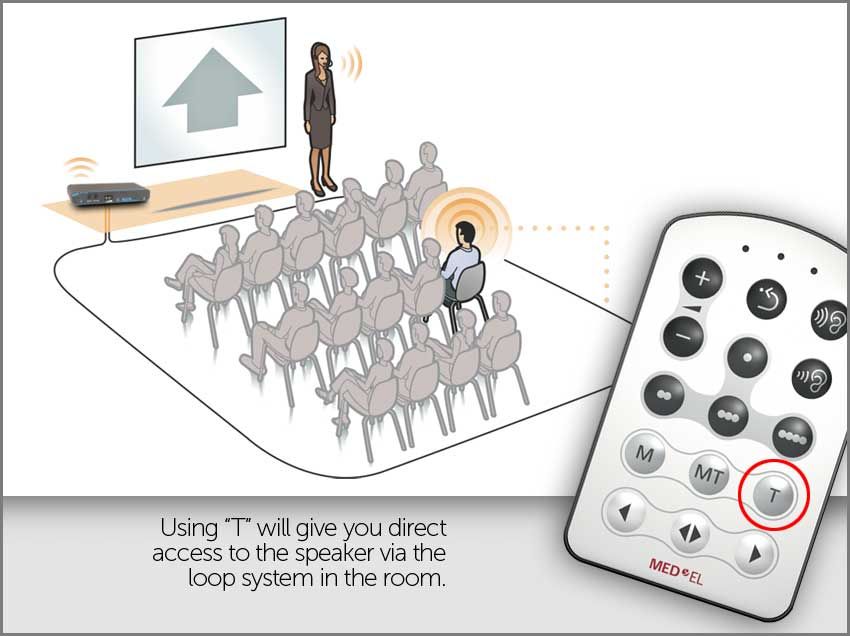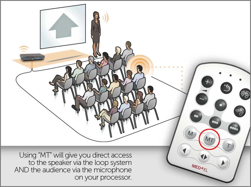 To illustrate the differences between “T” and “MT,” consider yourself in meeting room that has an induction loop system. This system is designed with a microphone that is connected to the speaker and his/her voice is transmitted through a wire that is looped around the room. Activating telecoil will allow you to hear the speaker very clearly. The room is also filled with other attendees.